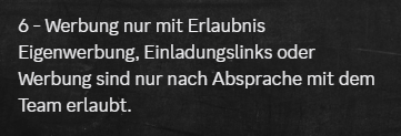 Regel 6 -> Eigenwerbung ist verboten, wenn Ossi sagt, sag denen die sollen auf den Discord kommen bist du der, der die Eigenwerbung im Call dann macht. Die Entscheidung kam nicht nur von mir, sie kam in Absprache mit Nika. Du brauchst dir die Mühe auch nicht machen. Wenn ihr im Call sagt, kommt rüber, macht ihr in dem Moment Eigenwerbung was verboten ist. (edited)